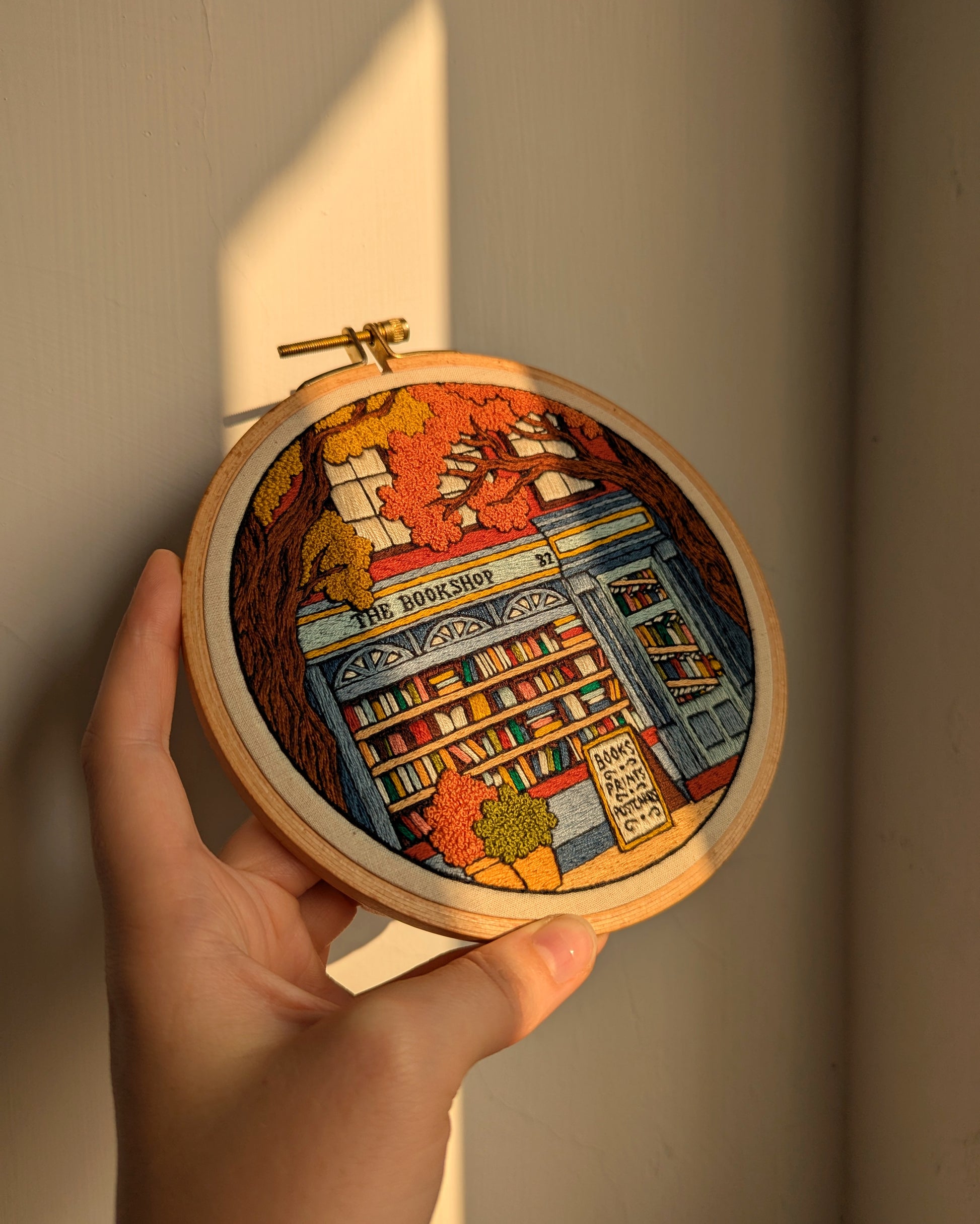 A 6" wooden embroidery hoop, depicting a bookshop beneath textured autumnal trees. The colour palette is so warm and inviting, this bookshop is a truly special embroidery!