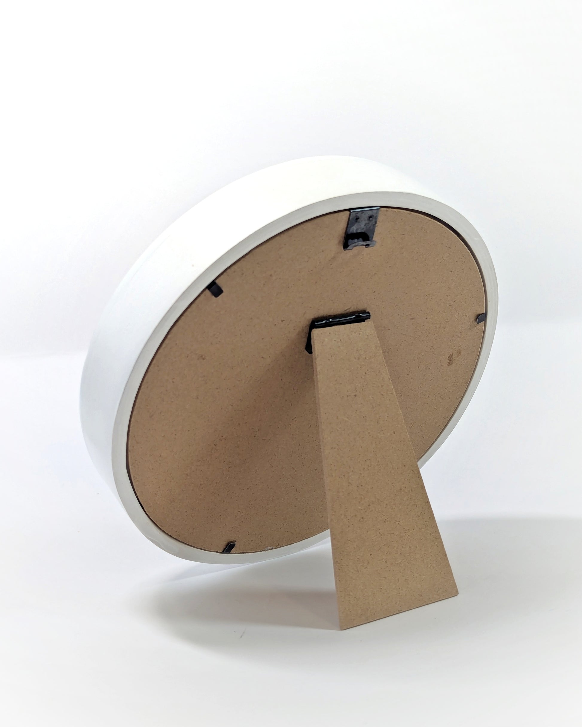 Framed in a 19.5cm x 19.5cm x 3.5cm white circular box frame. Can be stood or hung.