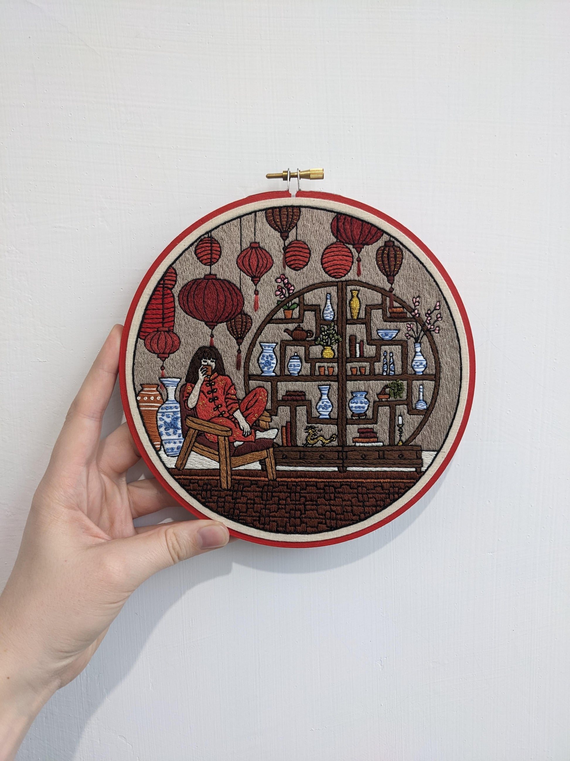 A 7" wooden embroidery hoop (outer hoop not included unless asked for), depicting a peaceful woman enjoying a cup of matcha, in front of a traditional Chinese cabinet which is filled with delightful details like blue and white ceramic vases and plants. Above are beautiful red lanterns, and below is an intricate terracotta tiled floor. There are lots of added gold details to make the piece feel extra special and celebratory.