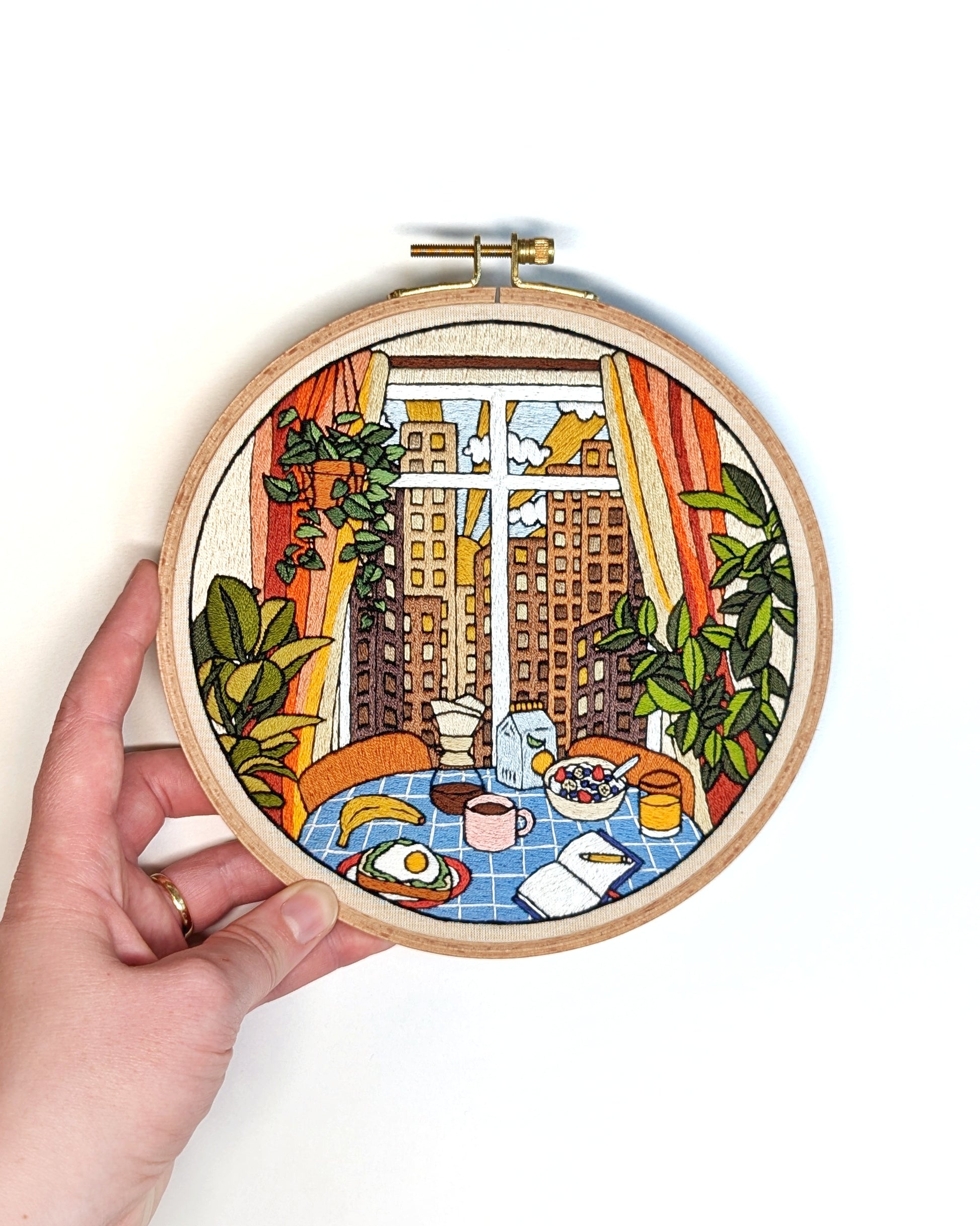A 7" wooden embroidery hoop, depicting a breakfast scene in a planty high-rise apartment, looking out over a city with the sun rising. The colours are vibrant and summery. Summer in the city can be so beautiful.
