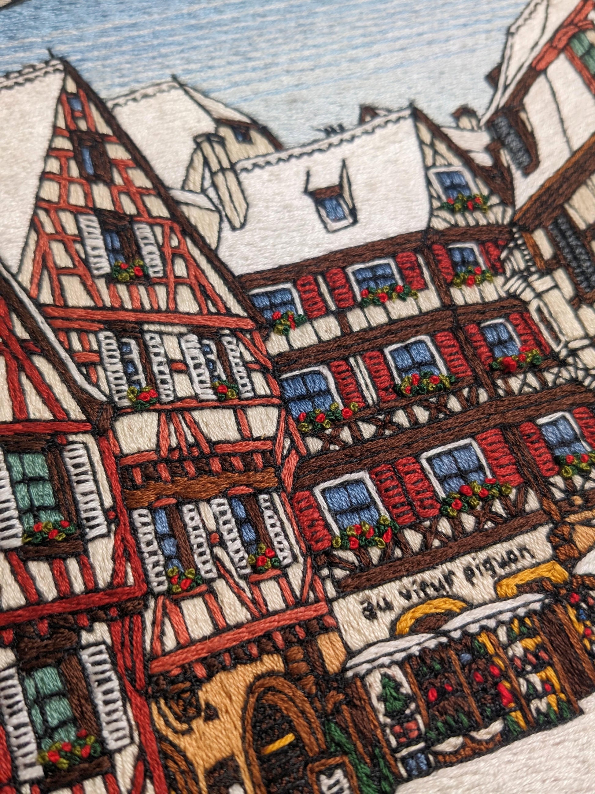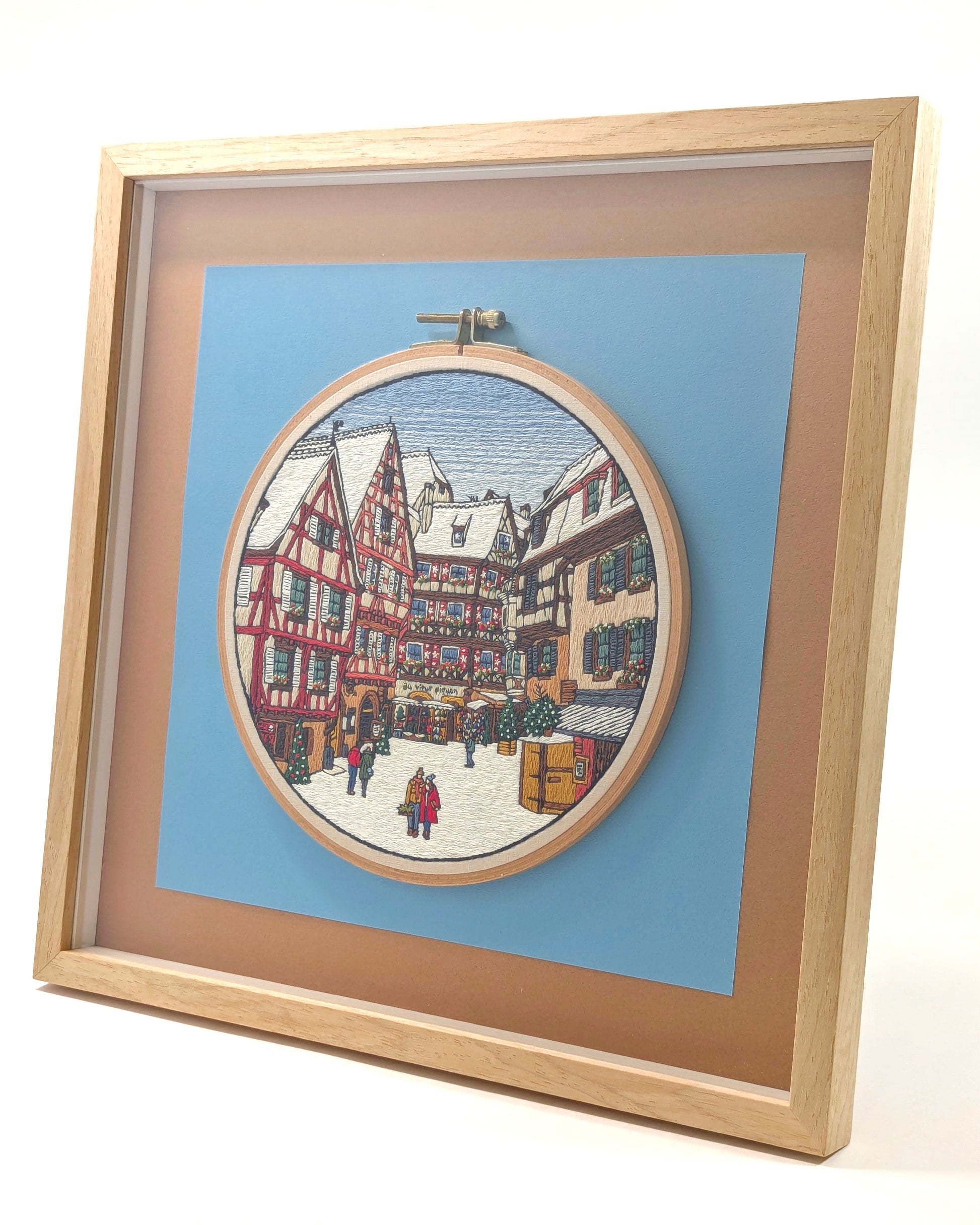 An 8" wooden embroidery hoop, depicting the charming town of Colmar, in the Alsace region of France. The town is famous for its Christmas market and magical winter atmosphere. The piece is extraordinarily detailed and intricate. This is a very special embroidery.