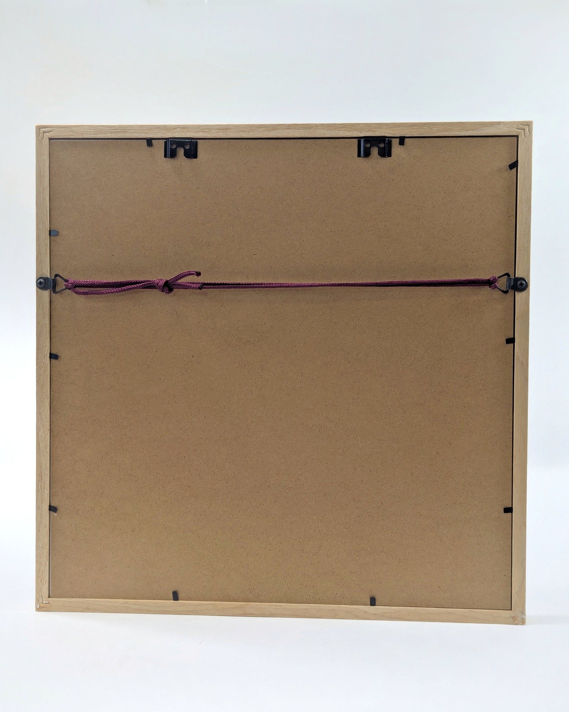 Framed in a 37.5cm x 37.5cm x 3cm wooden box frame. Can be stood or hung.