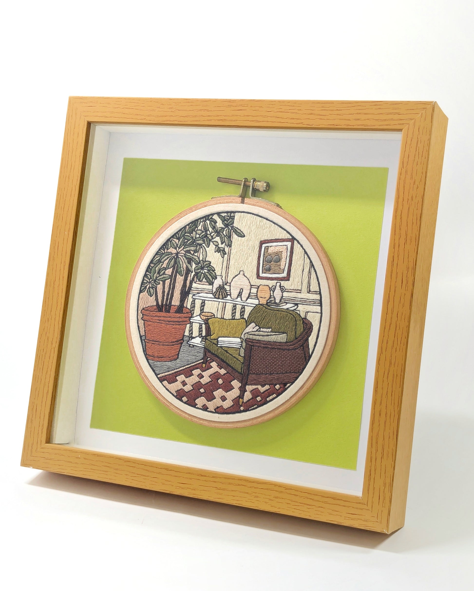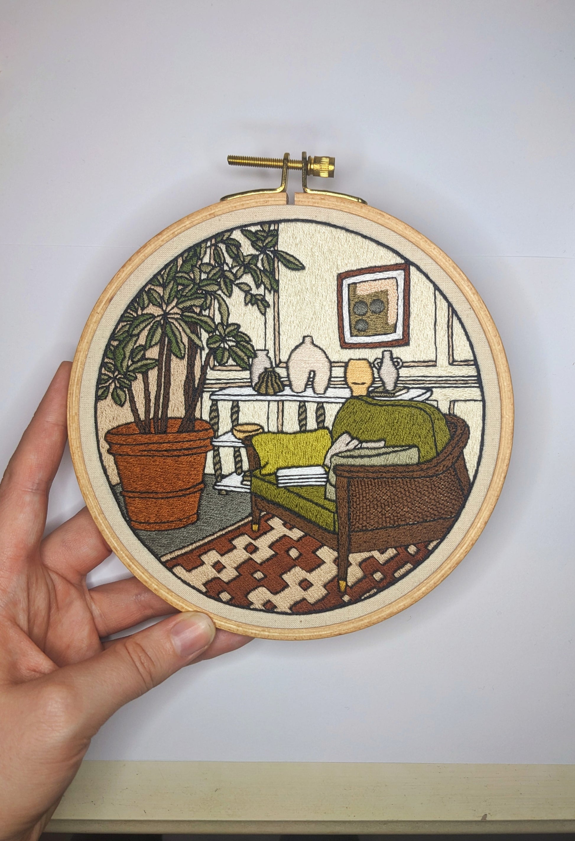 A 6" wooden embroidery hoop, depicting a peaceful and modern space. The green and neutral tones make this piece feel very cool and contemporary.
