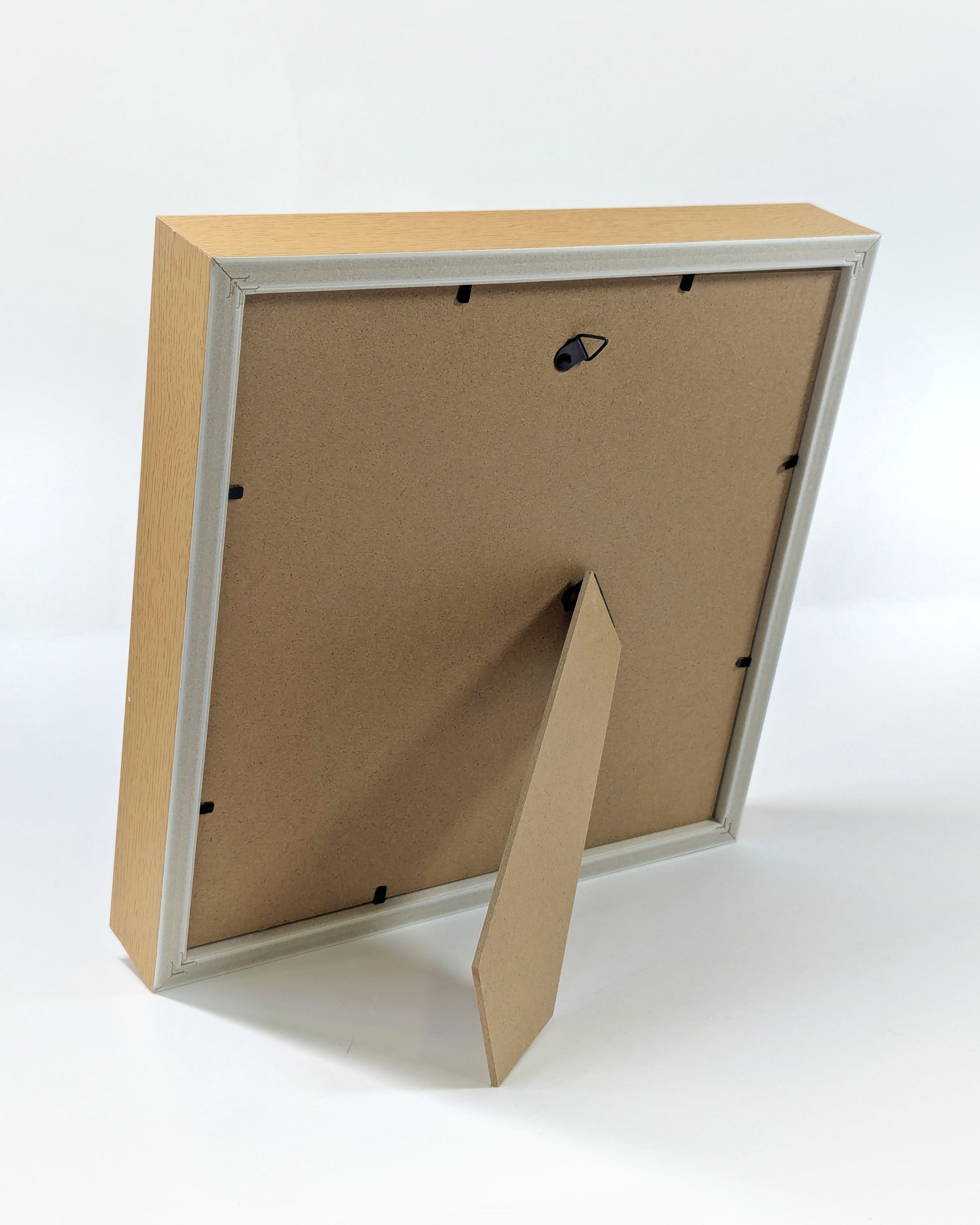 Framed in a 27.5cm x 27.5cm x 4.5cm wood-effect box frame. Can be stood or hung.