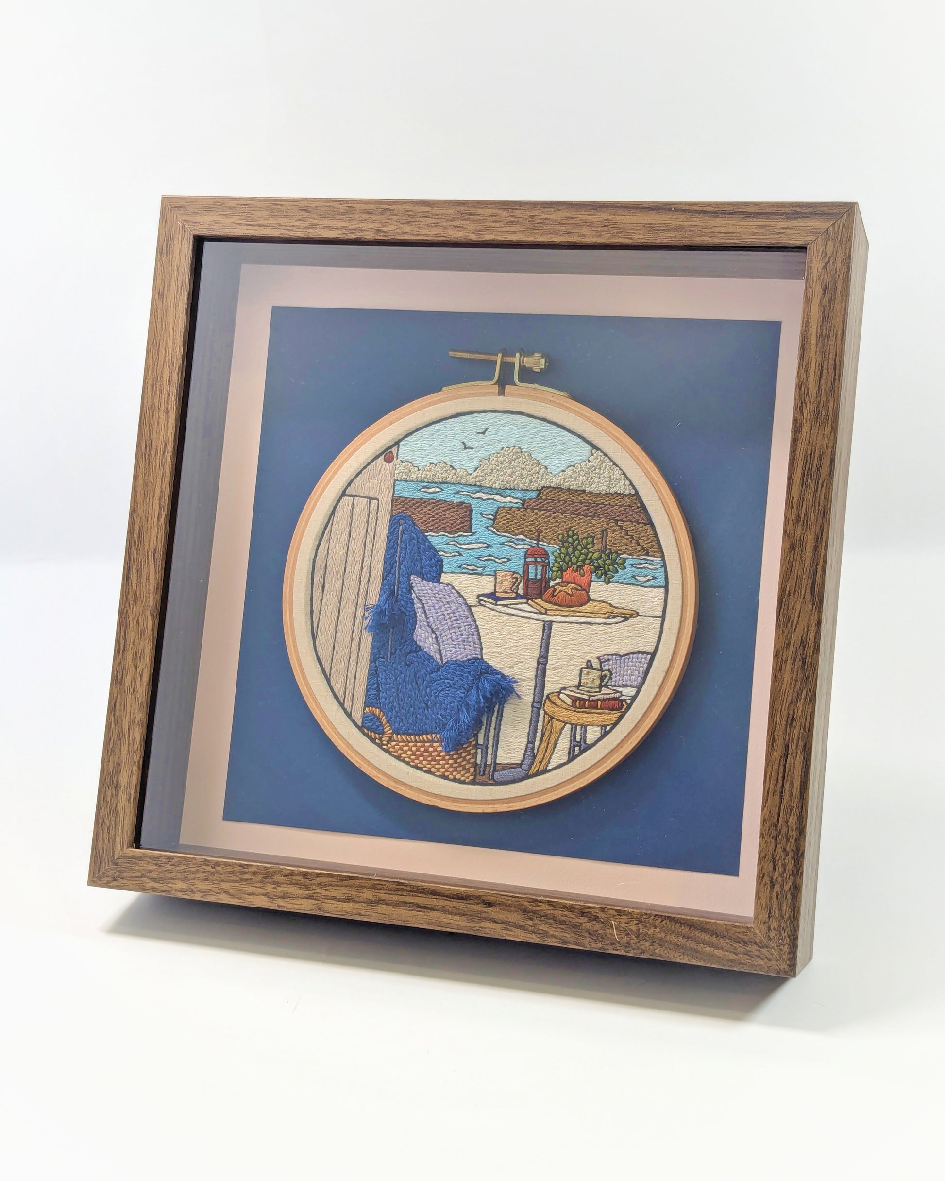 A 6" wooden embroidery hoop, depicting a peaceful view inspired by the beautiful seaside county of Cornwall, England. Different stitches have been used to create stunning texture which makes the art feel very intricate and layered.