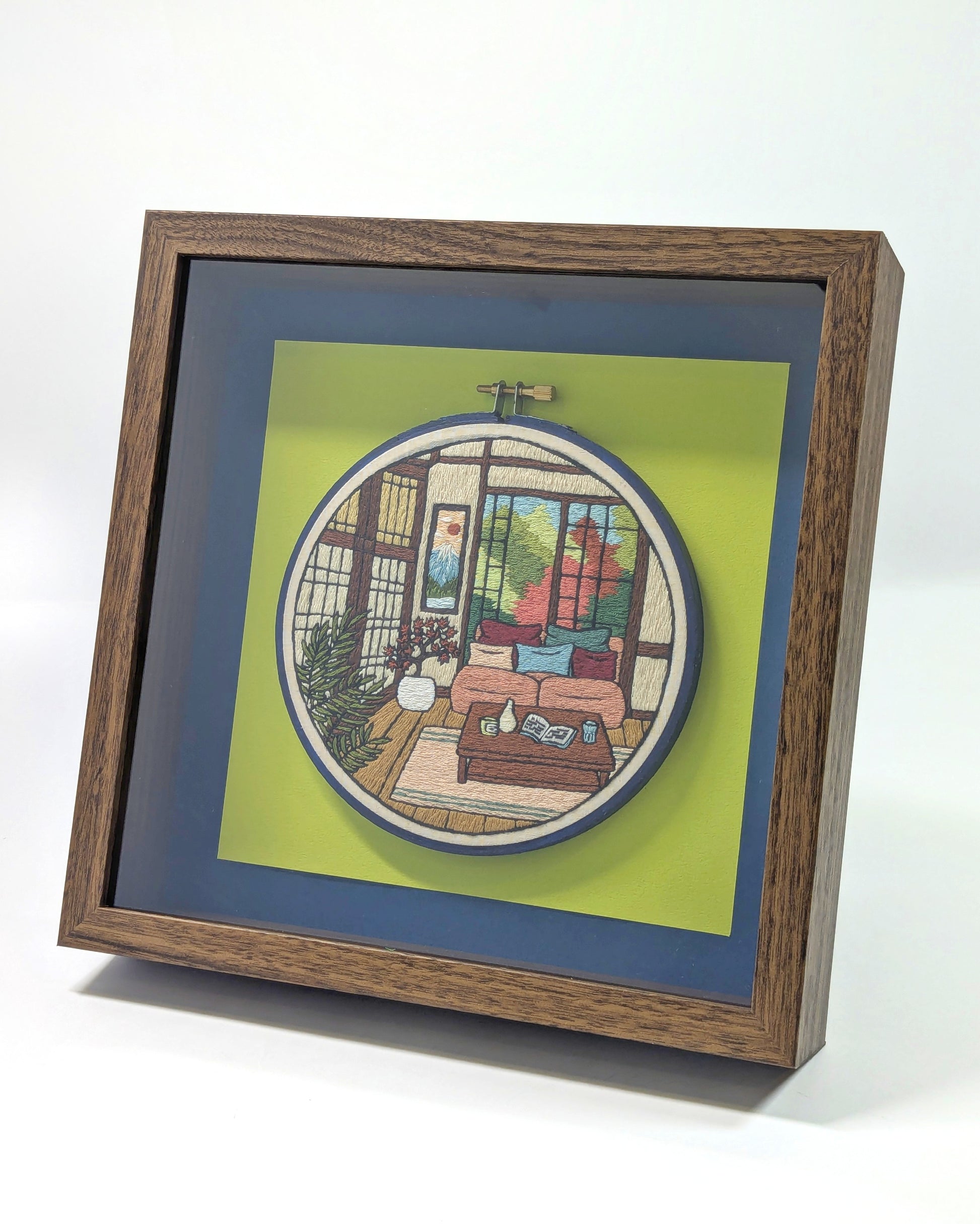 A 6" wooden embroidery hoop (painted navy blue), depicting a serene and peaceful Japanese interior.