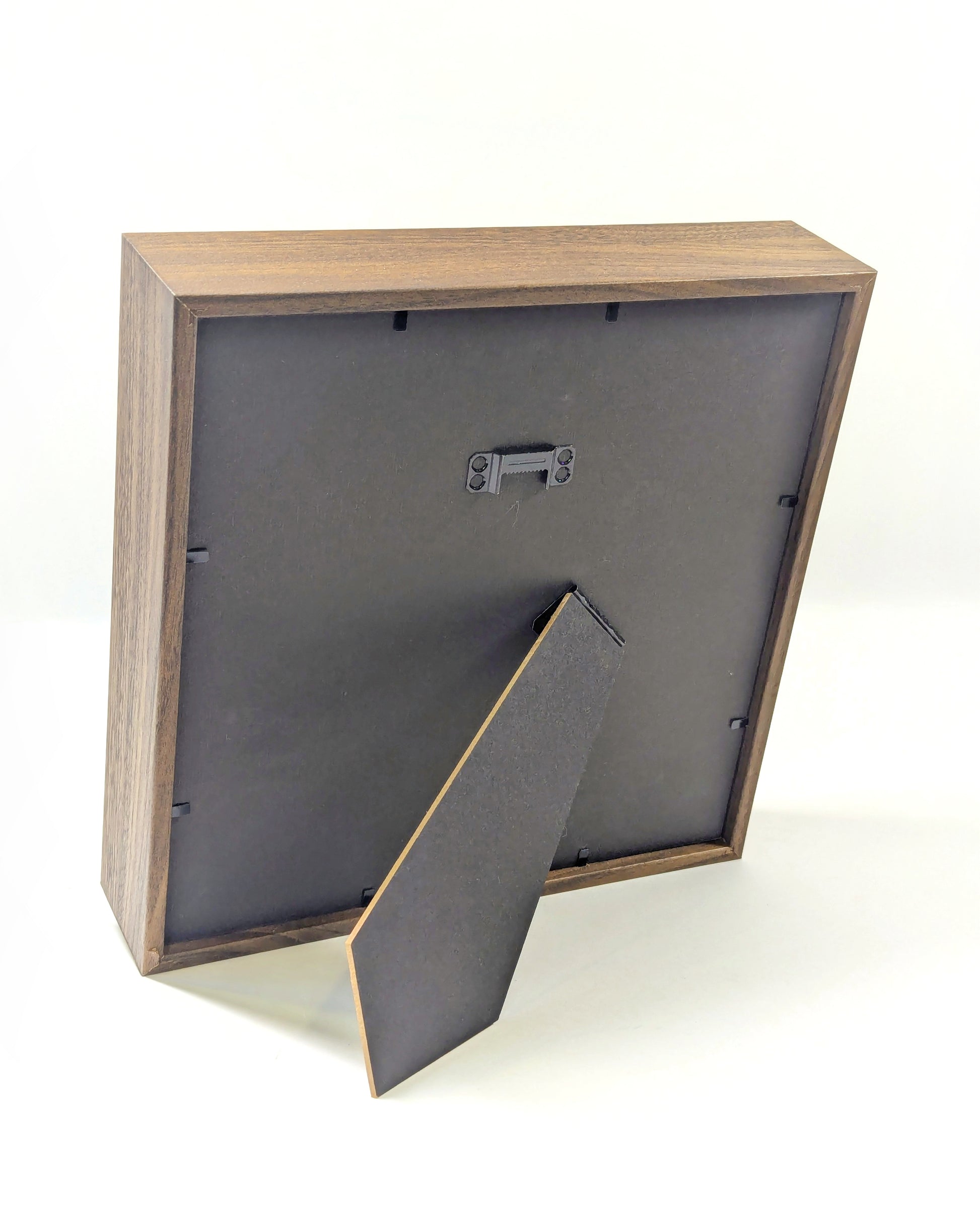 Framed in a 27cm x 27cm x 6cm wood-effect box frame. Can be stood or hung.