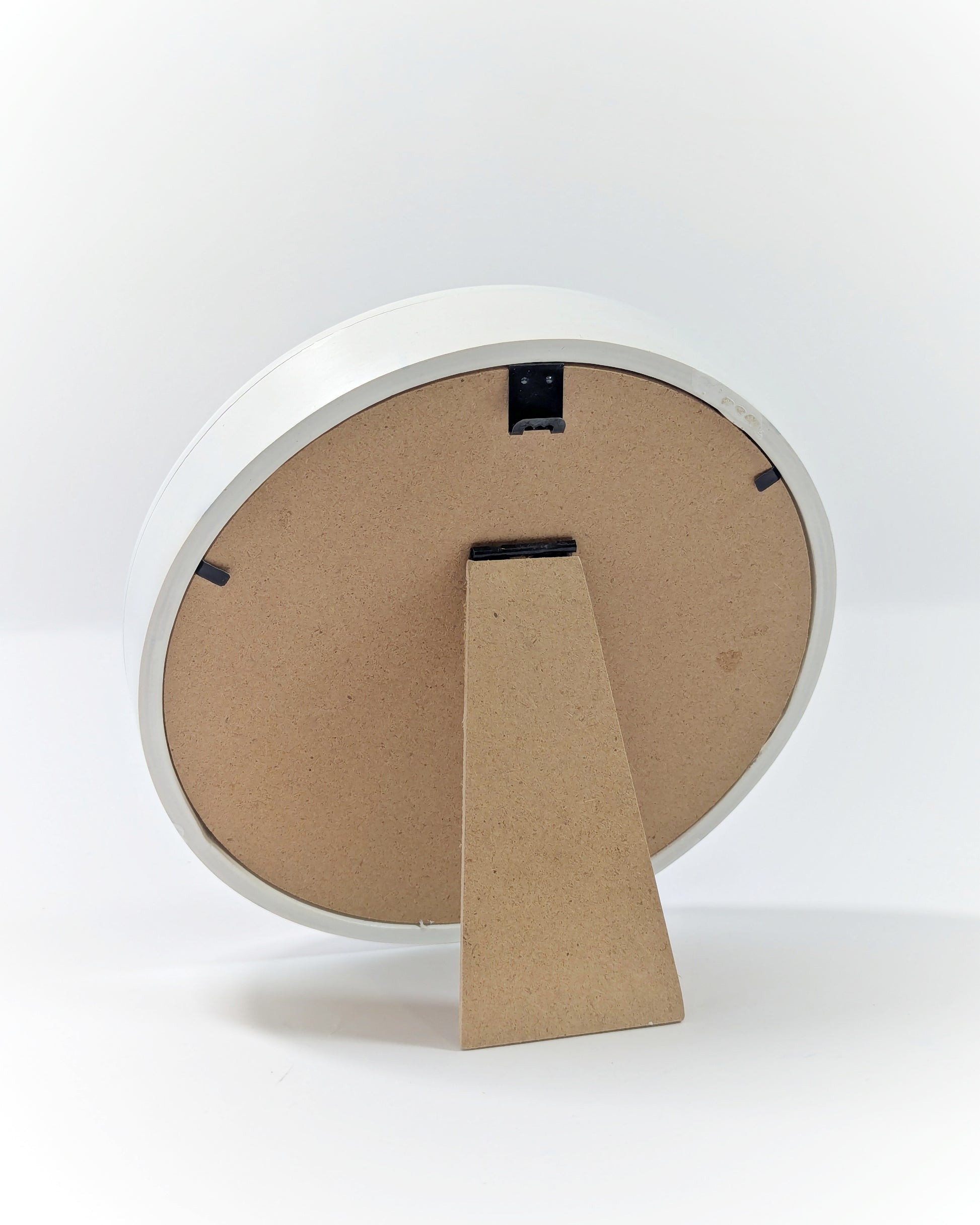 Framed in a 19.5cm x 19.5cm x 3.5cm white circular box frame. Can be stood or hung. There is a very slight surface scratch on the plexiglass, therefore £10 has been taken off the original price.
