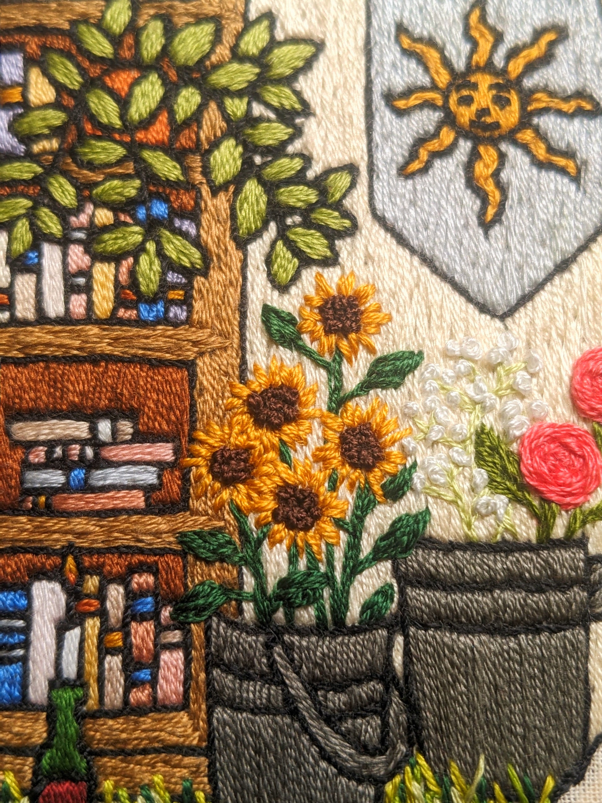 A 7" wooden embroidery hoop (outer hoop not included unless asked for), depicting a peaceful woman enjoying a glass of wine, in front of a bookcase and surrounded by flowers and plants, including a magical grass carpet which continues outdoors, to a beautiful tree. Finally, a string of clay roses sits at the top of the piece and frames the design with a feeling of summer and beauty.