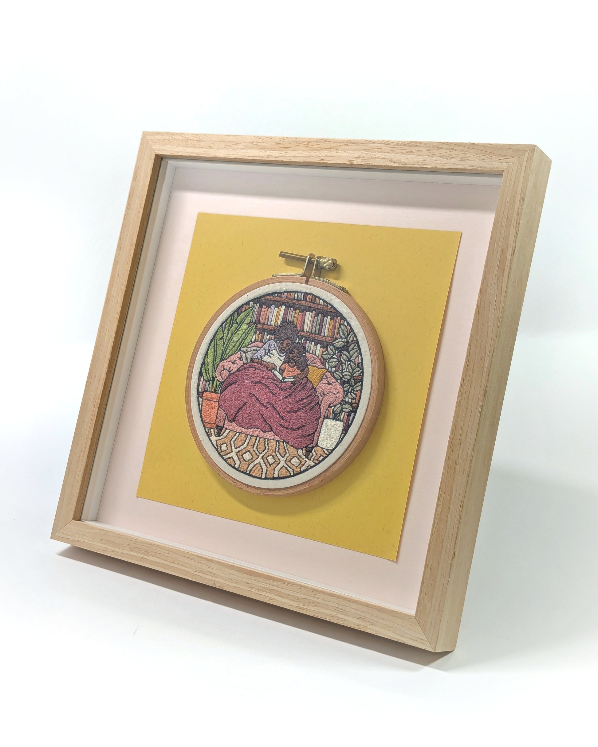 A 5" wooden embroidery hoop, depicting a mother and daughter reading peacefully in a big squashy chair, surrounded by books and plants. This piece was inspired by International Book Day and the joy of reading together.