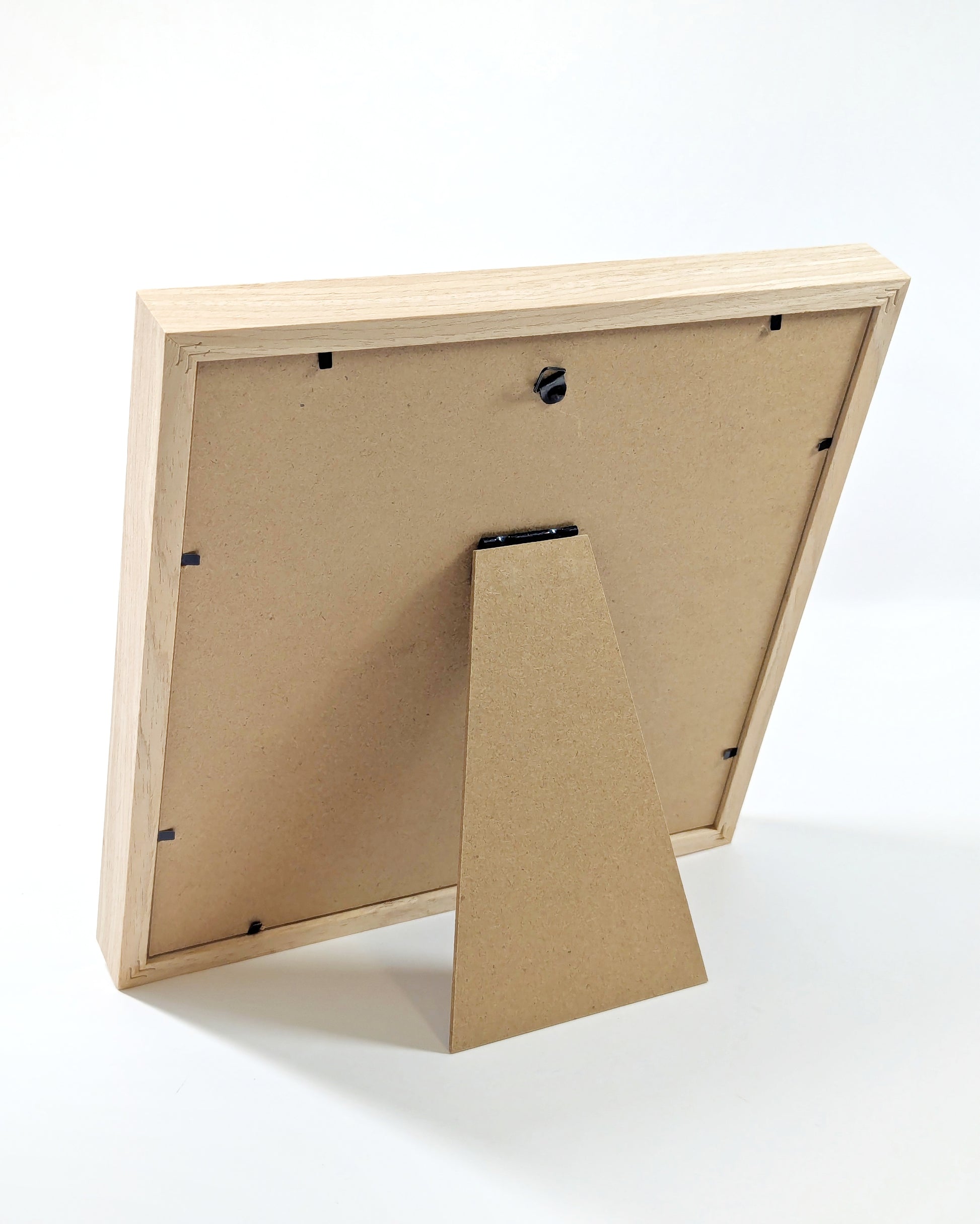 Framed in a 27.5cm x 27.5cm x 3cm wooden-effect box frame. Can be stood or hung.