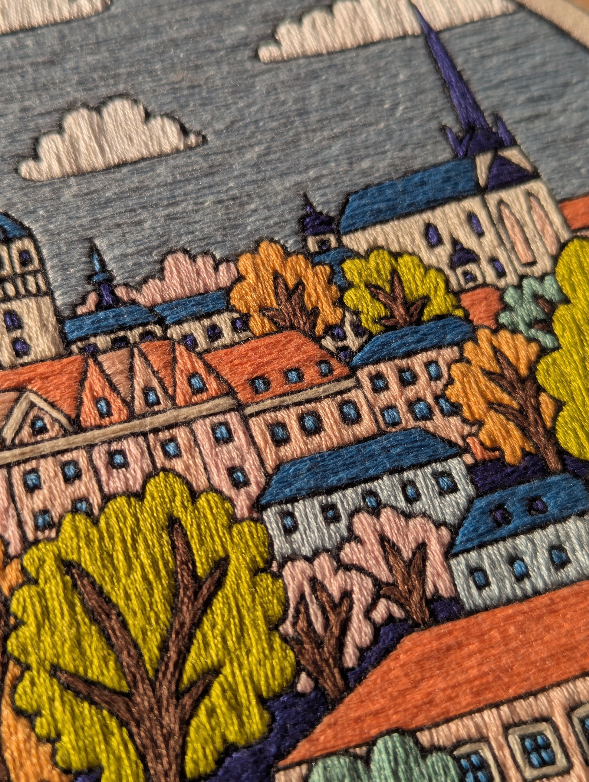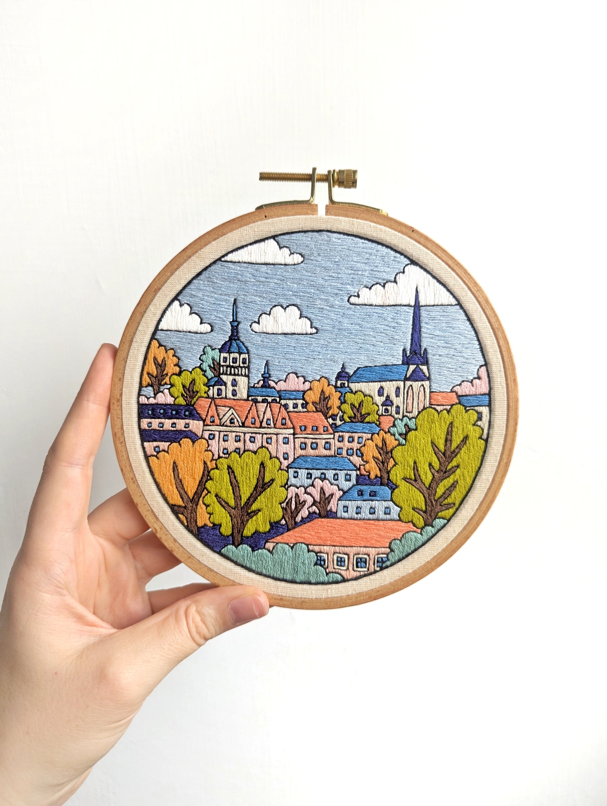 A 6" wooden embroidery hoop, depicting a colourful and vibrant stylized Munich skyline. Stitched whilst on holiday in Germany in the summer of 2025.