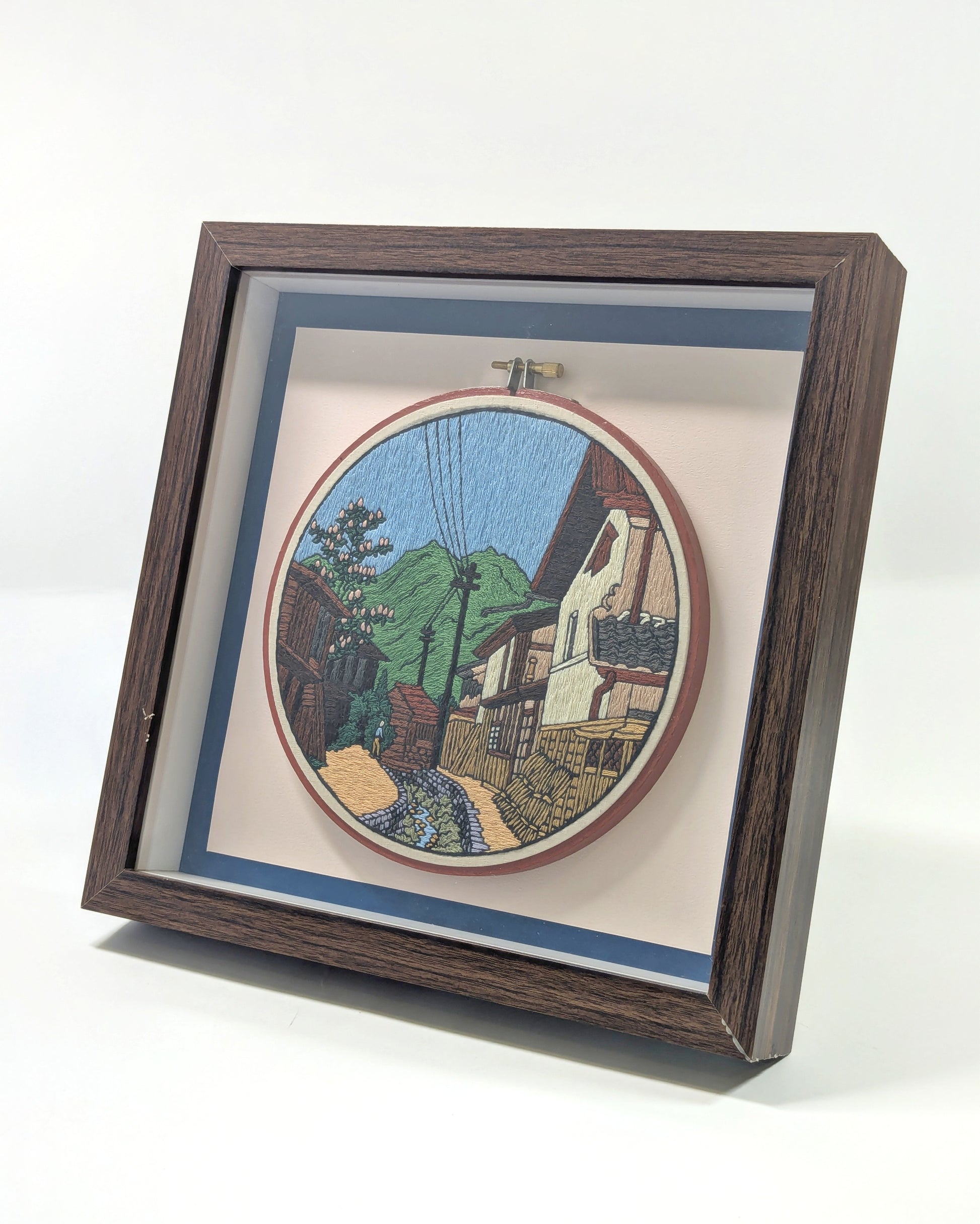 A 7" wooden embroidery hoop, depicting the painting of Nogami, Saitama by Kawase Hasui. A beautiful and serene Japanese village captured in thread.