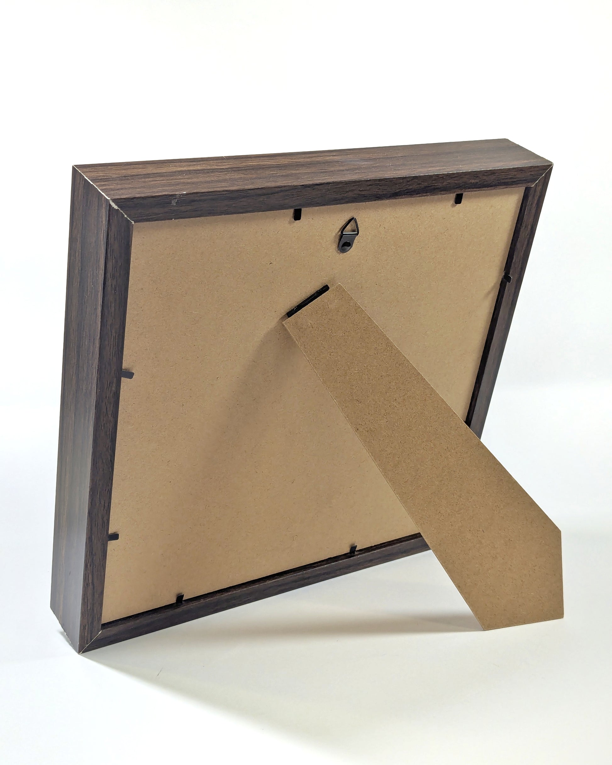 Framed in a 28cm x 28cm x 4.5cm wooden-effect box frame. Can be stood or hung. There is some slight damage to the frame, notably a scratch on the front bottom left corner. Therefore, £25 has been taken off the price.