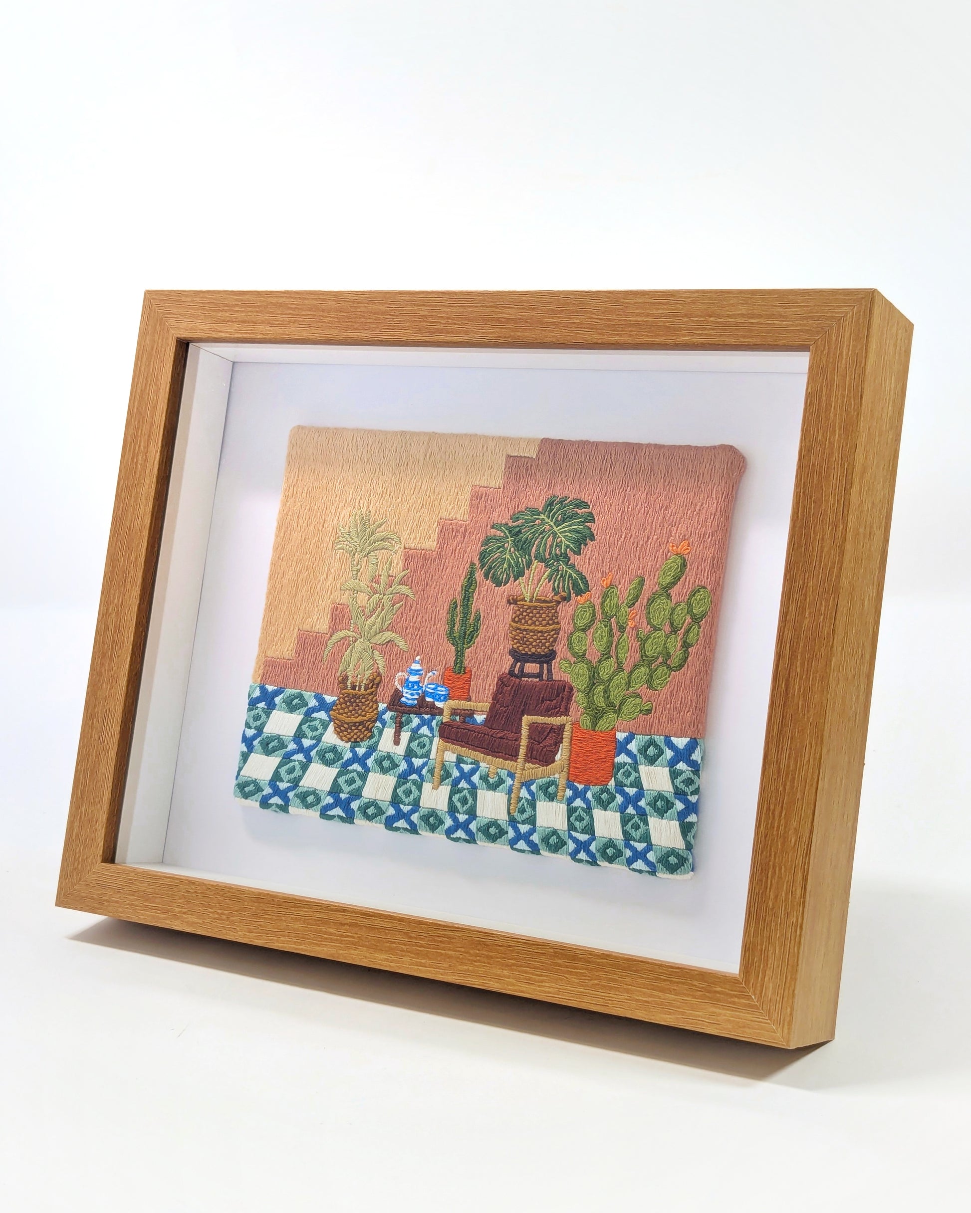 An entirely stitched scene mounted onto a 17cm x 13.5cm canvas board, depicting a peaceful Mediterranean scene. A comfortable chair sits amongst lush plants and cacti. The blue tiles contrast vibrantly with the dusty peach walls.