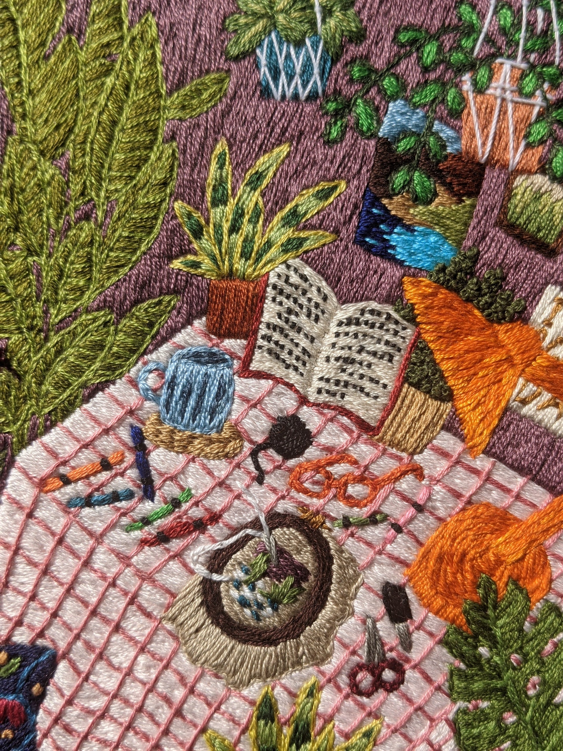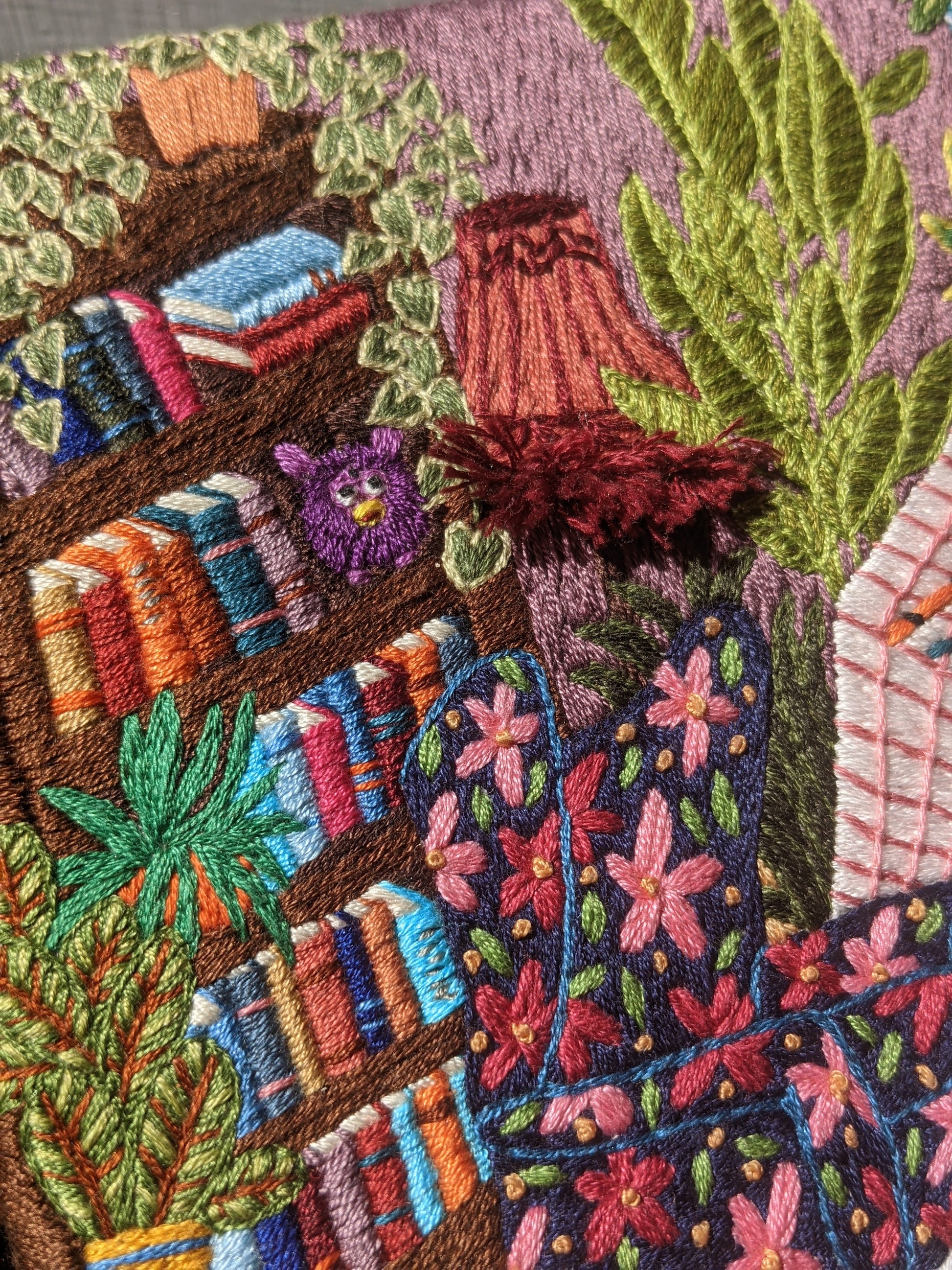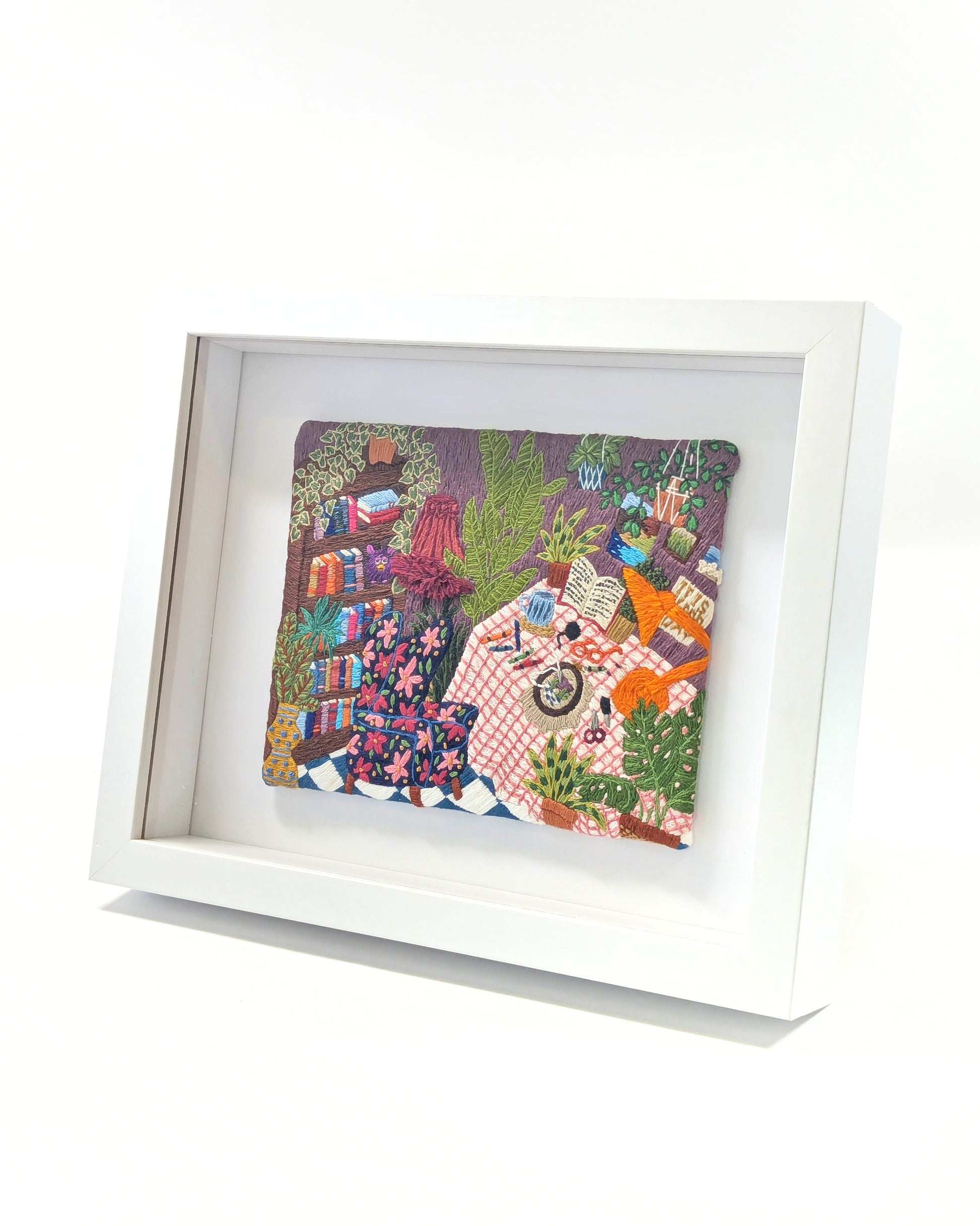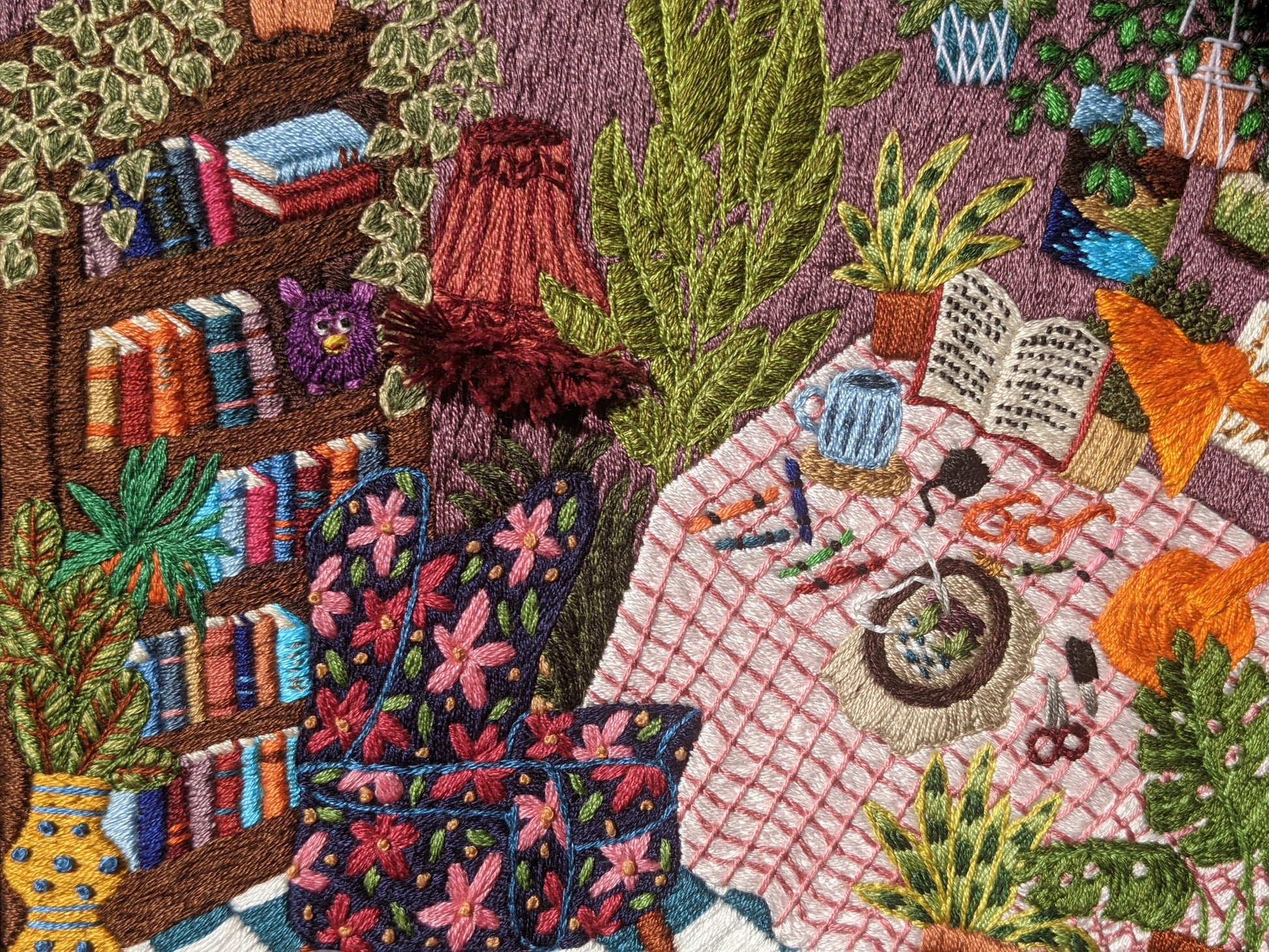 An entirely stitched scene mounted onto a 17cm x 13.5cm canvas board, depicting a colourful study. The scene features a floral armchair, bookcase, and messy crafting table. There are so many interesting details to wonder at, from a furby to the embroidery in progress!