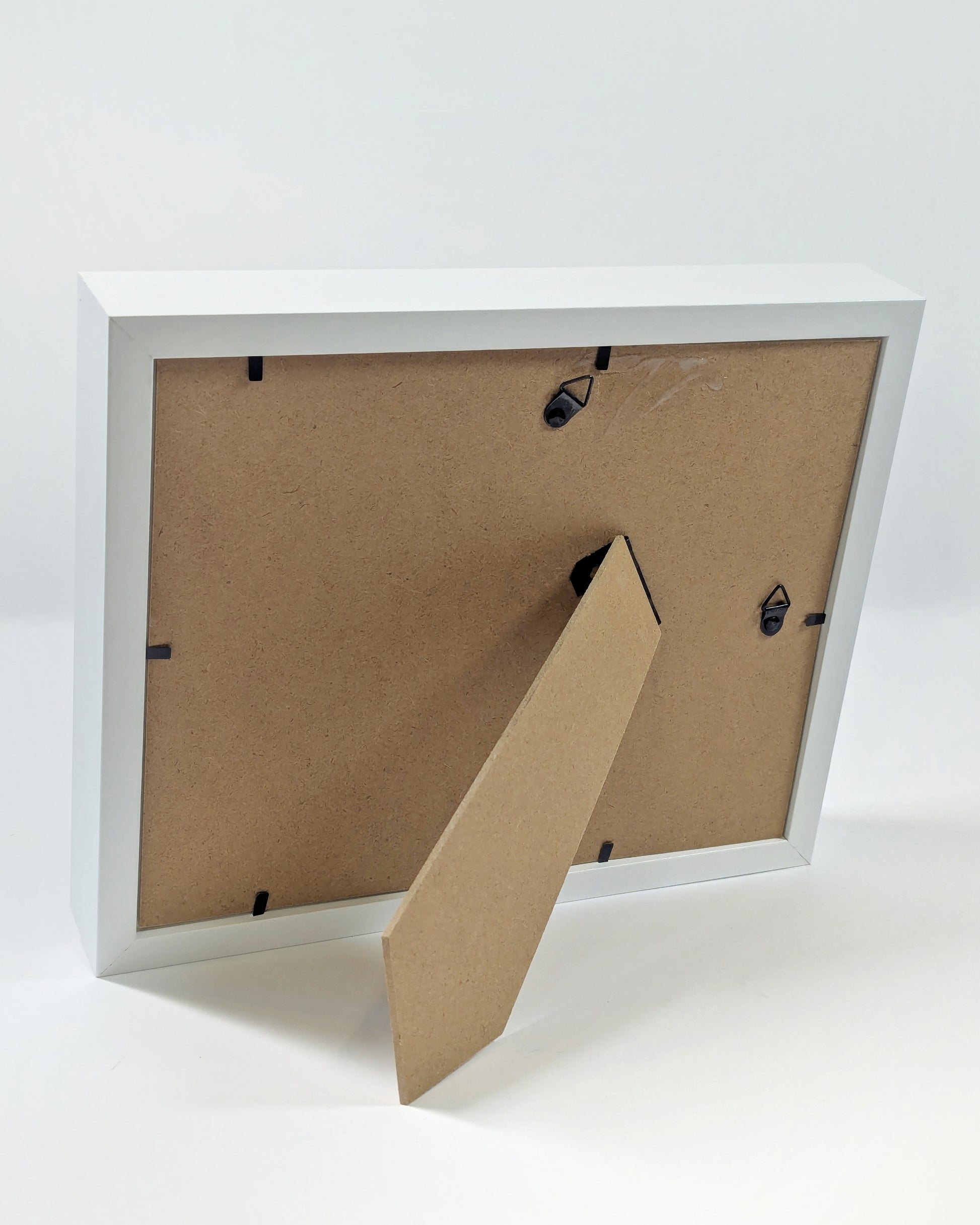 Framed in a 23cm x 28cm x 4.5cm white box frame. Can be stood or hung. There is some slight damage to the back board of the frame, therefore £25 has been taken off the price.