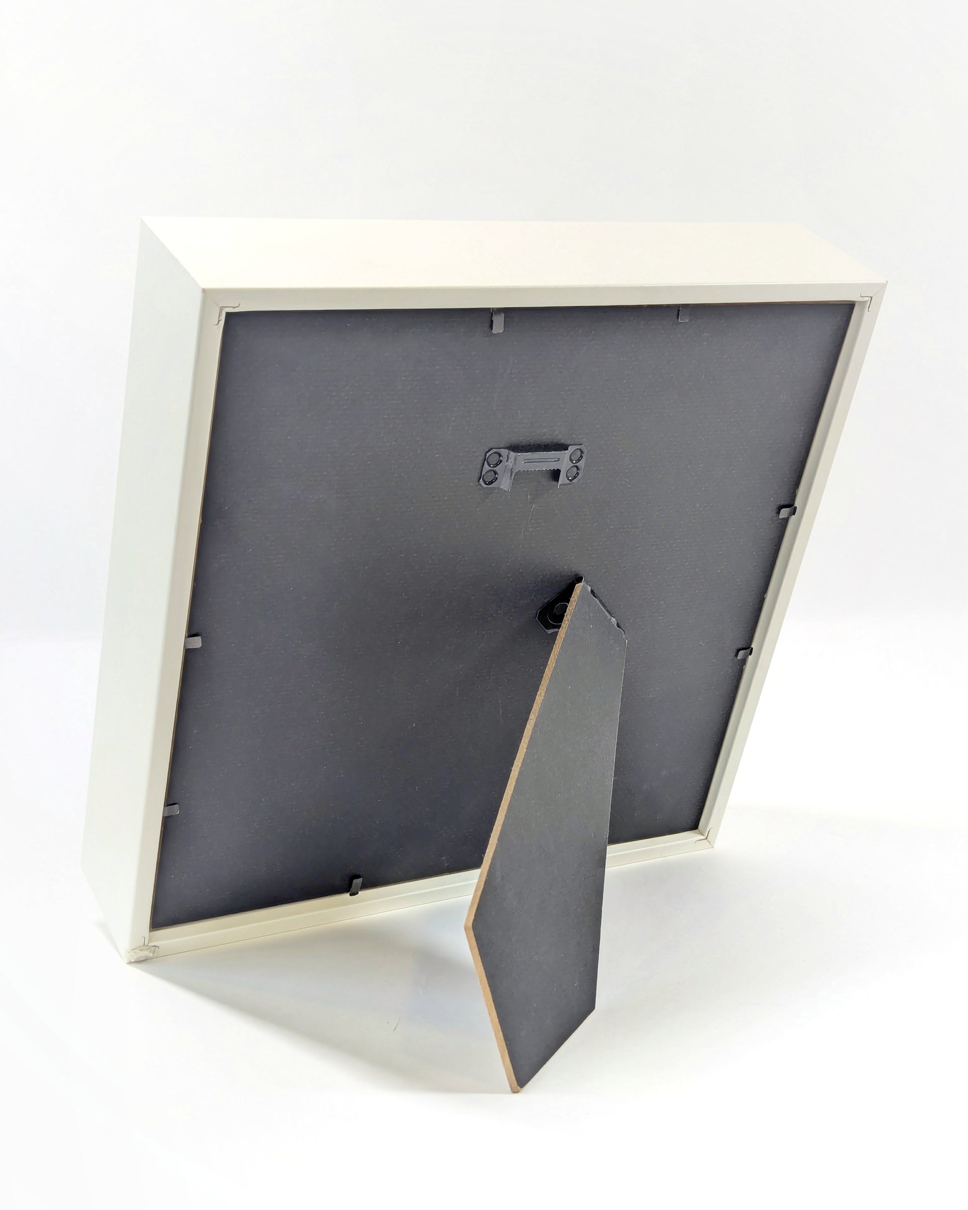 Framed in a 27cm x 27cm x 6cm white box frame. Can be stood or hung.