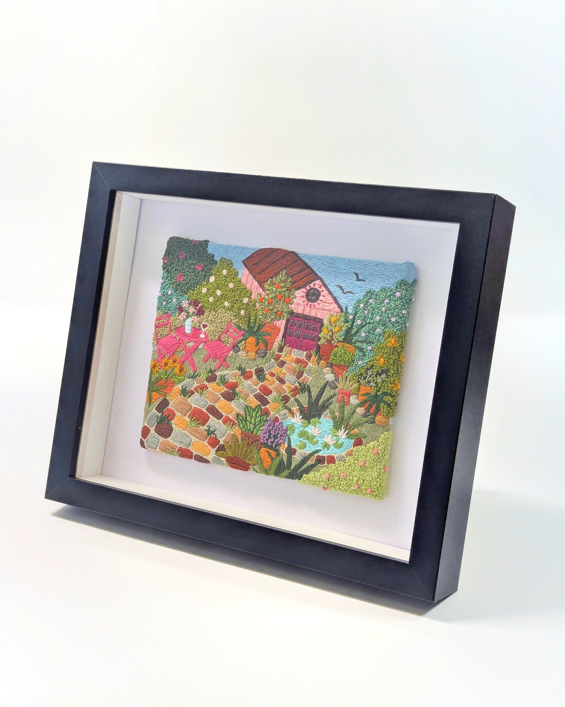 An entirely stitched scene mounted onto a 17cm x 13.5cm canvas board, depicting a colourful garden. There is a pink shed, table and chairs, pond, and plenty of textured beautiful planting.