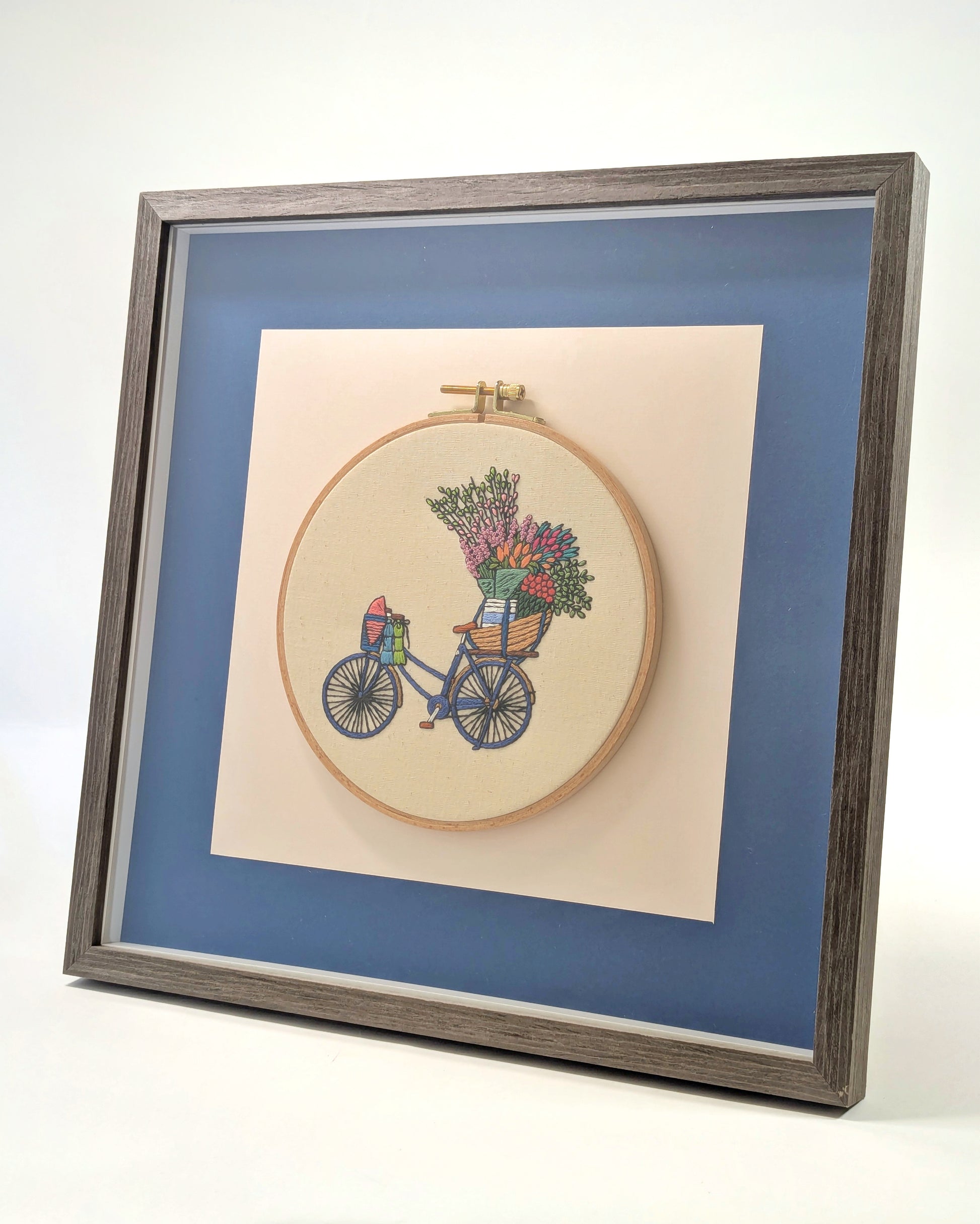 A 7" wooden embroidery hoop, depicting a traditional Vietnamese vendor's bicycle, loaded with fresh flowers for sale! The vibrant colours and intricate detail make this piece very special.