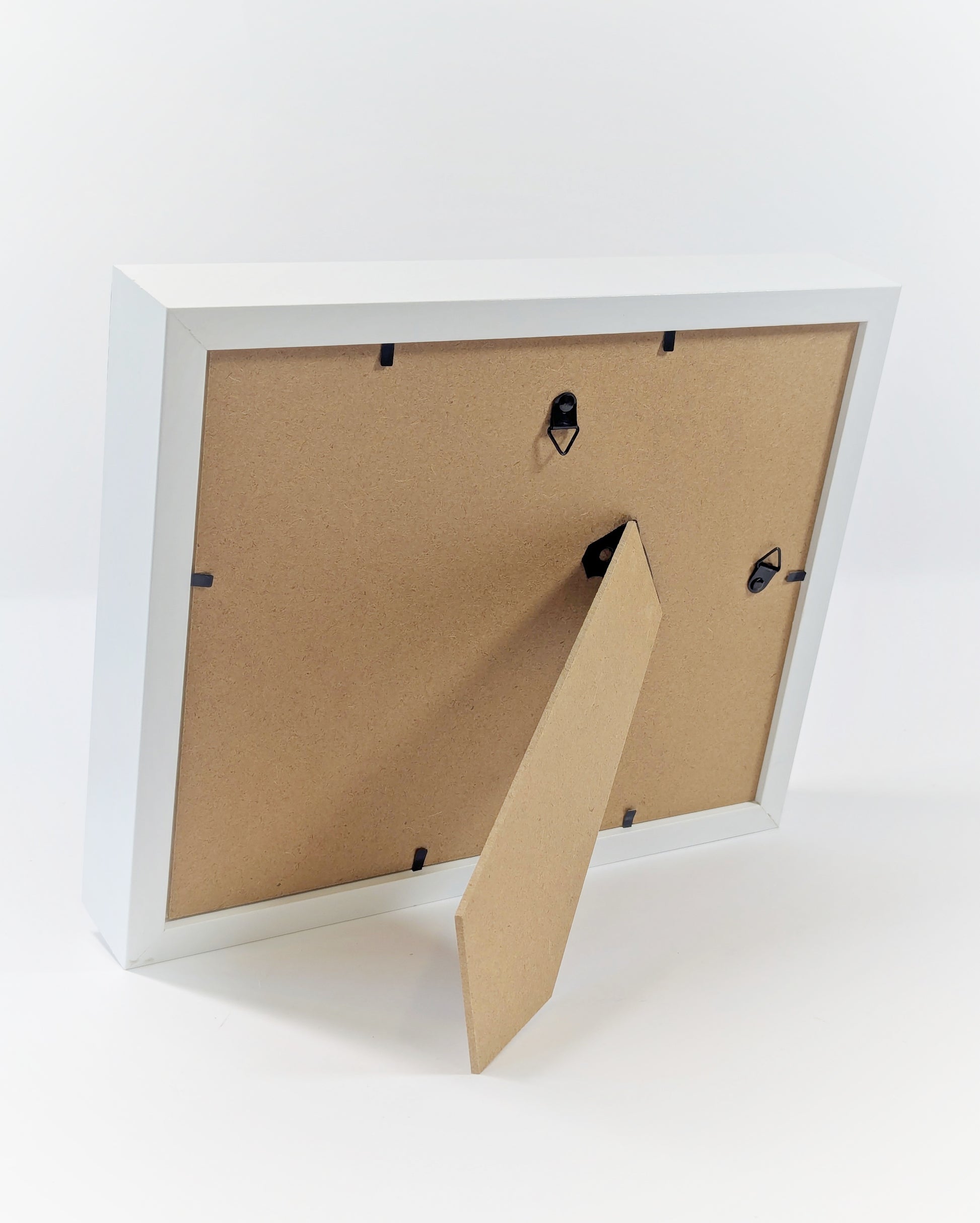 Framed in a 23cm x 28cm x 4.5cm white box frame. Can be stood or hung.